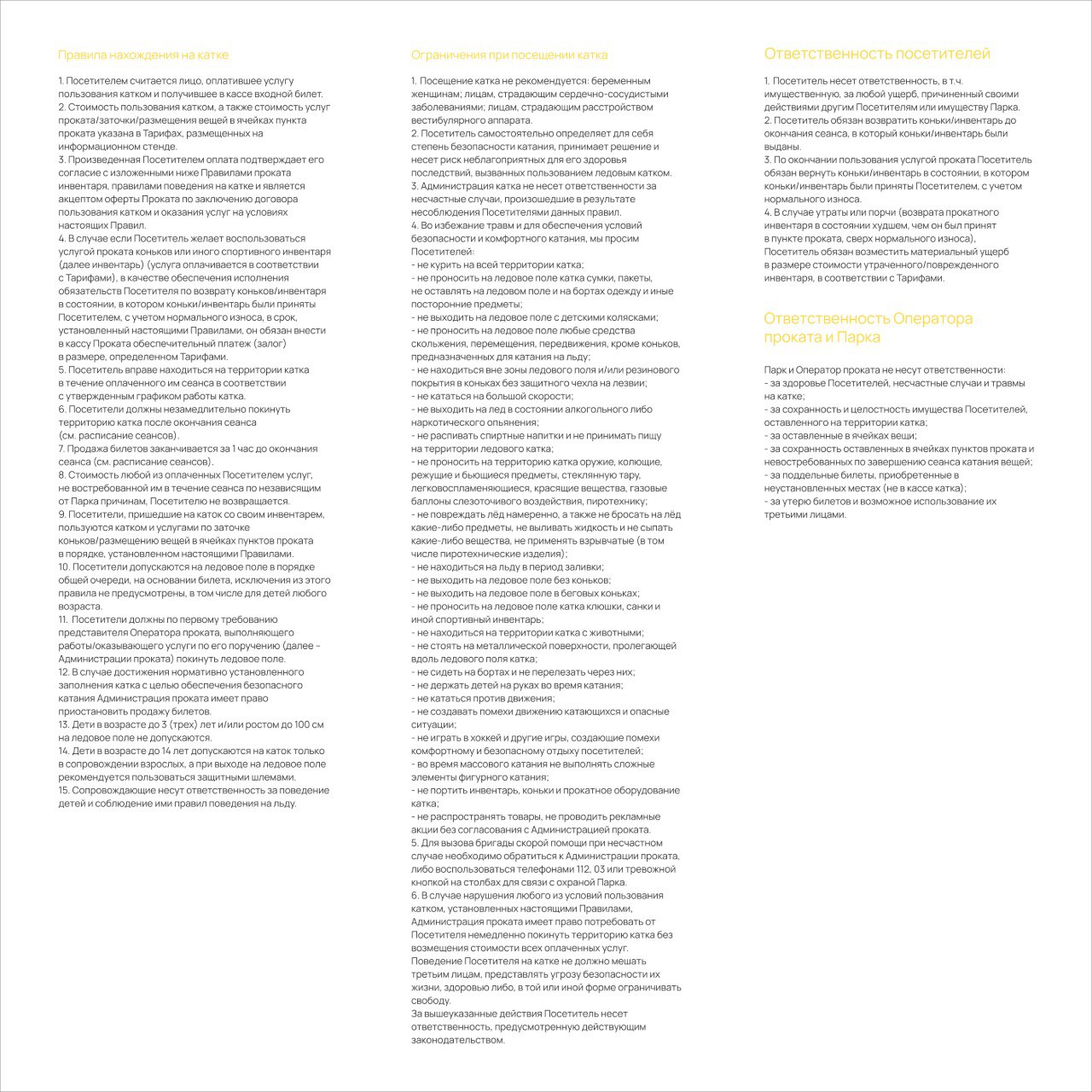 В стоимость билета входит проход на каток на один сеанс. Прокат коньков и защитного снаряжения оплачивается отдельно.